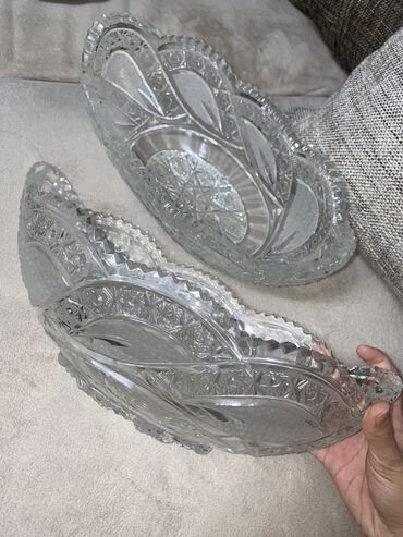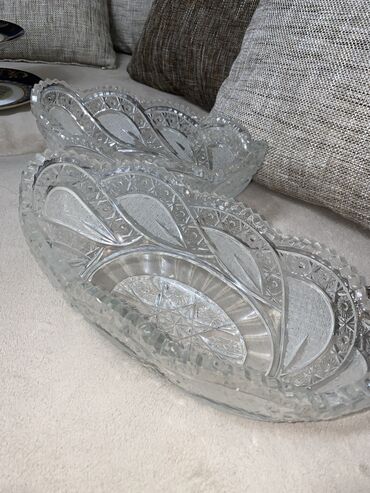Şüşə kəllə-kəllə naxışlı meyvə/gül qabı - Material: qalın, şəffaf şüşə (kristal effektli) - Forma: oval, yanları yüksələn - Kənar: diş-diş kəsimli dekorativ haşiyə - Naxış: iç hissədə ulduz, yarpa...