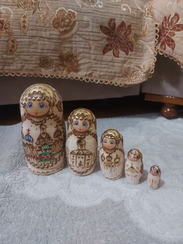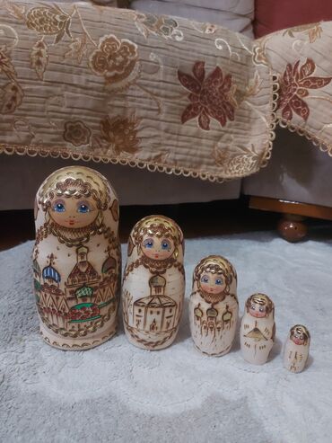 Matryoşka dəsti – 5 ədəd - Material: ağac - Rəngləmə: əl işi rəsm və yandırma (piroqraviya) detalları, qızılı vurğular - Dizayn: ən böyük fiqurun üzərində şəhər və məbəd motivləri, hər fiqurda mav...
