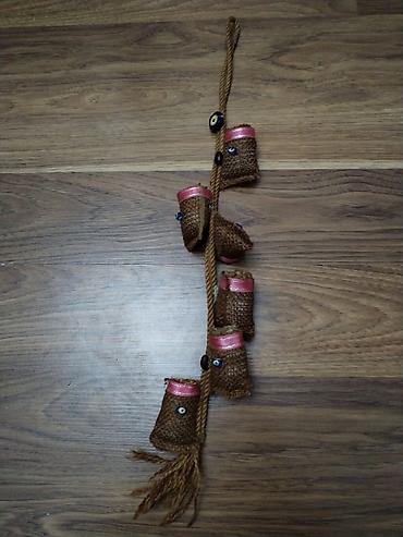 2) Şaquli asma dekor: qalın kəndirdən hazırlanmış uzun asılqan, üzərində 5 ədəd kiçik şüşə fişkə üçün cibi olan juta hissələr; dekorativ düymə və püsküllə tamamlanıb.
