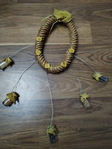 1) Halqa formasında asma dekor: kəndir və juta ilə bükülmüş oval çərçivə, üzərində sarı güllər; halqadan metal tellərlə sallanan 6 kiçik şüşə fişkə. Divar və ya qapı üçün dekorativ asılqan kimi istifadə olunur.