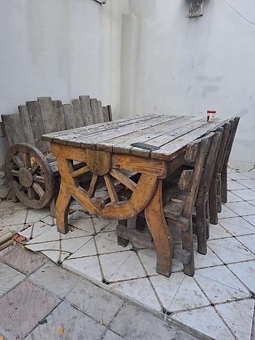 - Üslub: kənd/rustik dizayn, araba təkəri motivli massiv taxta ayaqlar, kobud taxta lövhələrdən masaüstü və oturacaq səthləri.