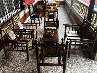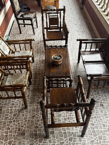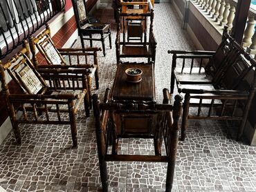 - Komplekt: 1 uzun oturacaq (2 nəfərlik), 2 ədəd iri kreslo, 2 ədəd kiçik taburet/qonaq oturacağı, 1 uzun dar mərkəz stolu