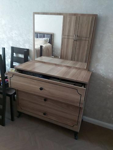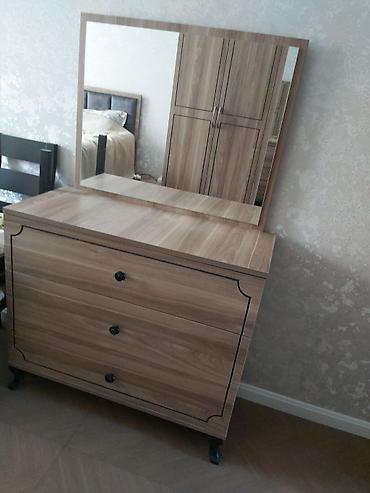 Mebel: Ayna ilə kosmetik stol (toaletka) - Material: ağac teksturlu laminat/LDSP - Rəng: tünd qəhvəyi (ceviz tonları) - Üst hissə: geniş iş səthi - Ayna: böyük, yarımdairə başlı, masanın arxa pane...