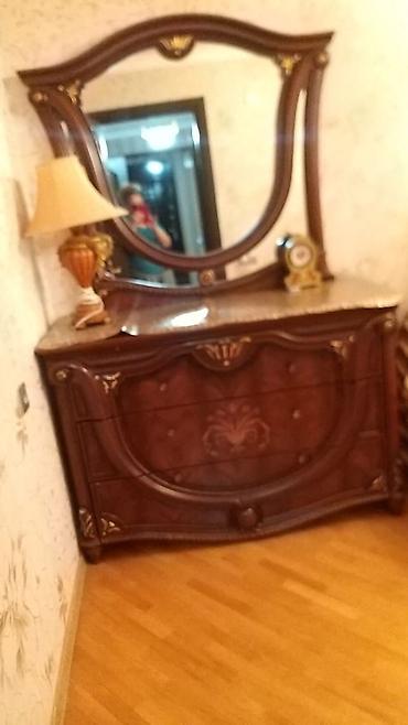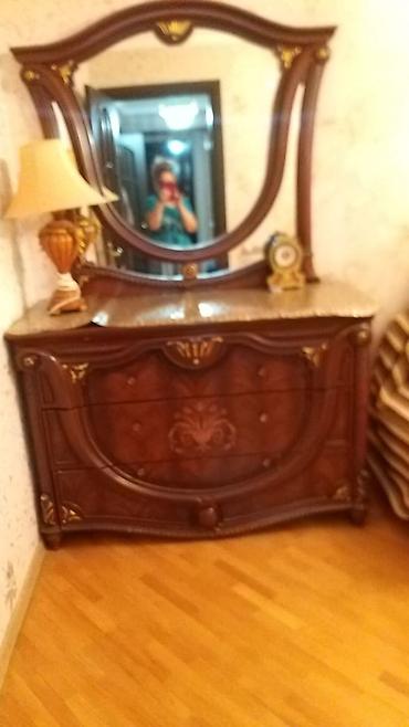 Tualet masası və komod dəsti - Material: taxta/MDF əsaslı, tünd qəhvəyi rəng - Komplekt: böyük güzgü ilə tualet masası üstü və 3 geniş çekmecəli komod korpusu - Güzgü: iri ölçülü, üfüqi yerləşdiri...