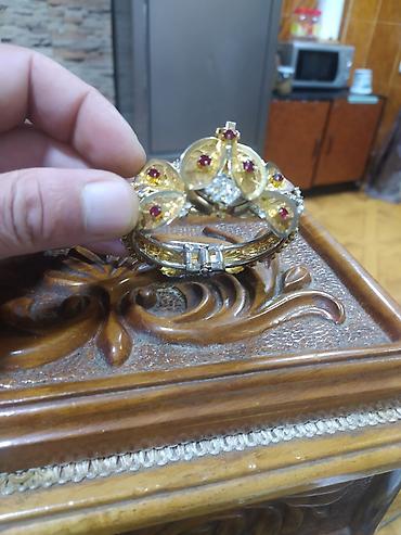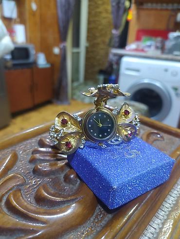 - Qızılı rəngdə qadın qol saatı: dairəvi qara rəqəmsiz siferblat, metal bilərzik-forma korpus, dekorativ yarpaq və daş naxışları, mexaniki düymə ilə vaxt tənzimləmə