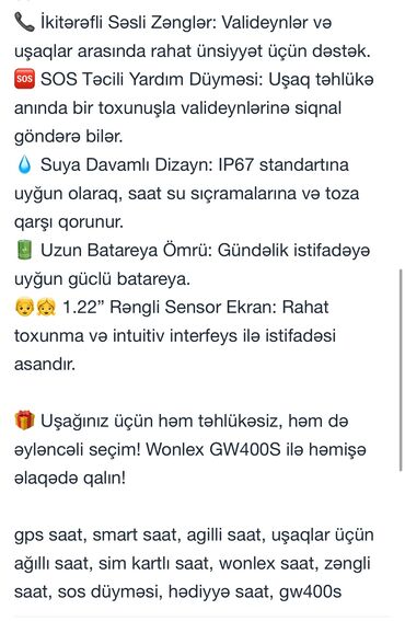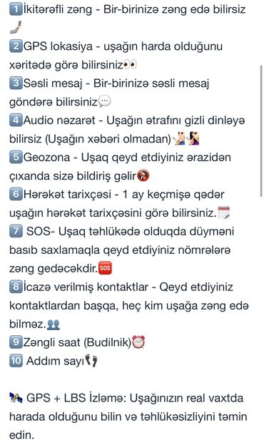 Smart Saat.⌚ 🕹️ Gps. 🔦 Fanar. 📞 Usaga zəng edirsiz. 📞 Usaq size zeng edir. 🔊 Ses atmaq olur. 💌 Mesaj yazmaq olur. 📸 Gizli seklin cekirsiz usagin. 📢 Gizli sesine qulaq asirsiz. 📲 Azercell,Bakcell,Na...