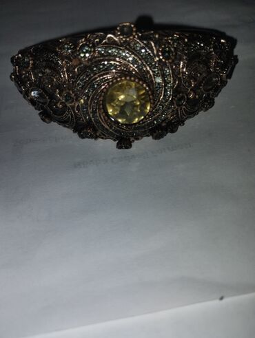 - Geniş ornamental dizaynlı qolbaq/braslet: tünd metal rəngdə, mərkəzdə iri sarı daş, səth boyunca xırda daş naxışları.