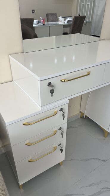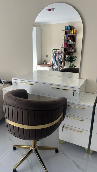 GüzgülüSaç güzgüsü. 1 aydır yığdırılıb. Demək olarki istifadə olunmayib. Yeni qalıb. Hər siyirməsində kilid var. 3 ədəddir. 2 ini satırıq. 1 i 270 azn. Ünvan Buzovna. (Oturacaq satılmır. )