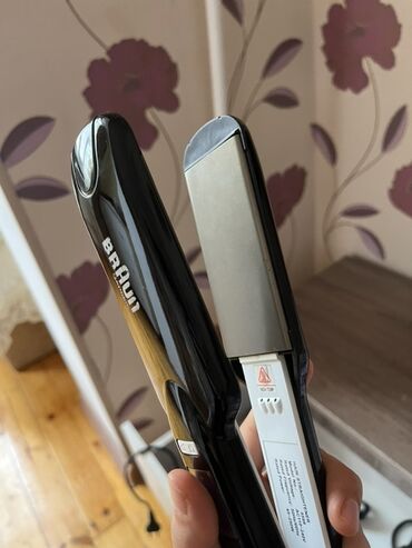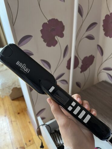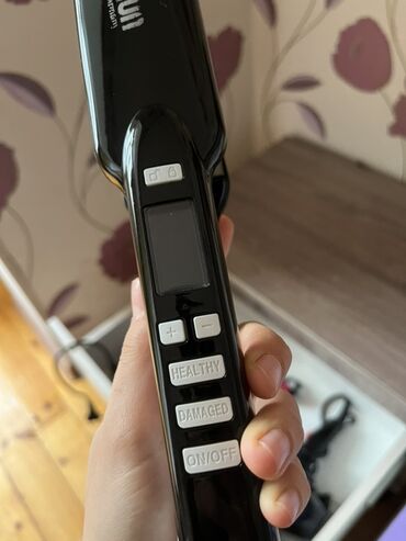 - Avtomatik saç burqısı (qara, “BRaun” yazılı model): LCD ekranlı idarəetmə paneli, +/− temperatur tənzimlənməsi, “HEALTHY” və “DAMAGED” saç rejimləri, ON/OFF düyməsi, təhlükəsizlik üçün kilidləmə işarəli düymələr. Elektriklə işləyir, kabeli var. Saçı özünə çəkərək vahid, səliqəli burğular yaradır.