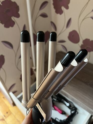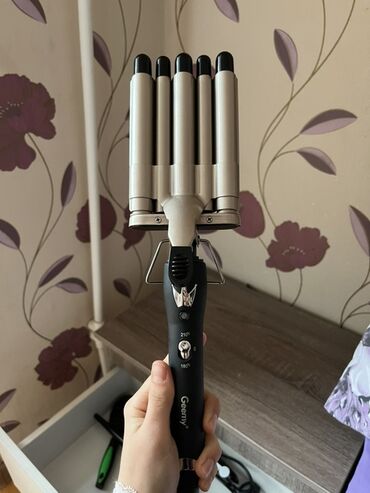 - Dalğa effekti verən 5 borulu saç maşası (Geemy): 5 parallel borudan ibarət geniş başlıqla sürətli “beach waves” və ya dərin dalğalar. Korpusda 180°/210° temperatur seçimləri, açıb-söndürmə düyməsi, dayaq ayağı.