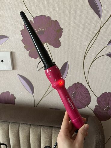 - Konus formalı saç maşası (çəhrayı “BORUUN” yazılı): Ucdan əsas hissəyə doğru genişlənən konus başlıq sayəsində fərqli ölçülü burğular. Göstərici işığı ilə qızma vəziyyətini bildirir. Dayaq ayağı mövcuddur.