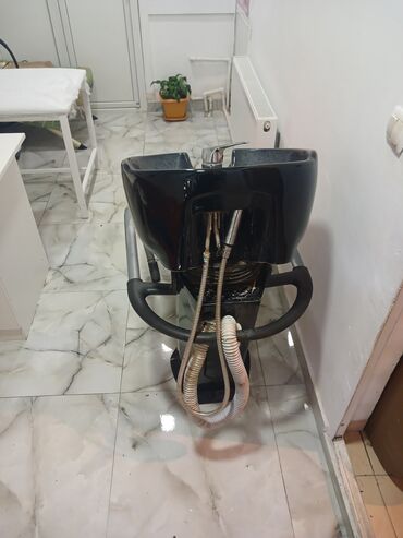 Salon üçün saç yuma kreslosu və lavabo - Rəng: qara - Material: yumşaq süni dəri oturacaq və bel hissəsi, möhkəm metal/süngər karkas - Lavabo: qara keramika/plastik kasa, kran və duş başlığı üçün ...