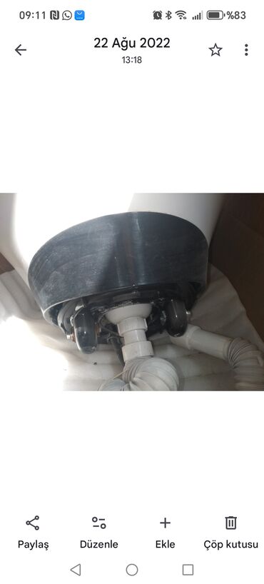 - Alt hissə: nasos/mühərrik bölməsi üçün korpus, su giriş–çıxış boruları və sifon bağlantıları görünür.