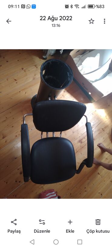 - Kreslo: salon tipli, qara süni dəridən oturacaq və arxalıq, xromlanmış metal tutacaqlar və dayanıqlı gövdə. Yuyucu lavaboya qoşulmaq üçün arxa hissəsindən su/kanalizasiya xəttlərinin keçməsi nəzərdə tutulub.