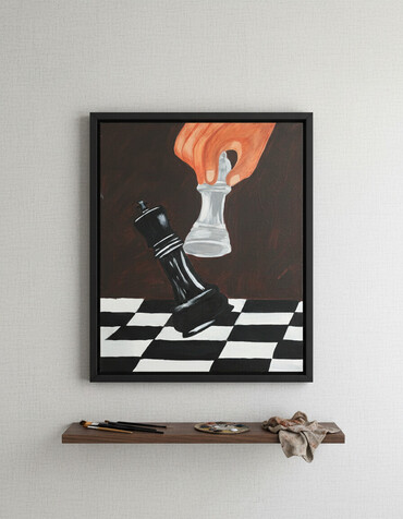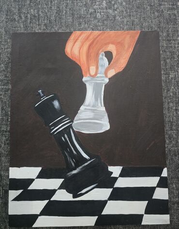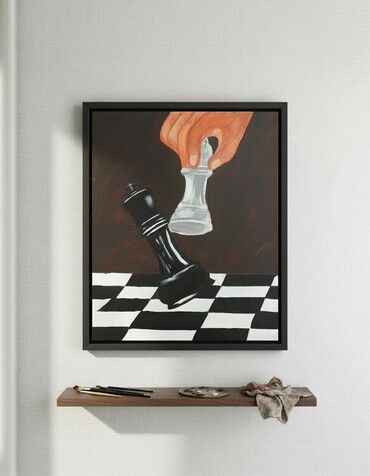 - Mövzu: şahmat taxtasında final gedişi; əl şəffaf ağ fiquru (qüvvətlə işıqlandırılmış və yarıkeçirən effektlə) hərəkət etdirir, qarşıdakı qara fiqur yıxılma anında təsvir olunub.