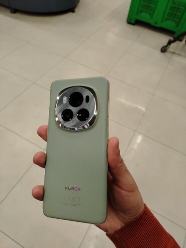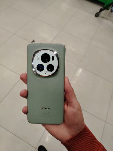 HONOR Magic6 Pro – flaqman smartfon Xüsusiyyətlər: - Model: HONOR Magic6 Pro - Rəng: açıq yaşıl arxa panel, parlaq metal çərçivə - Ekran: kənarlara doğru əyri, ön kamera üçün pil‑şəkilli kəsik, ek...