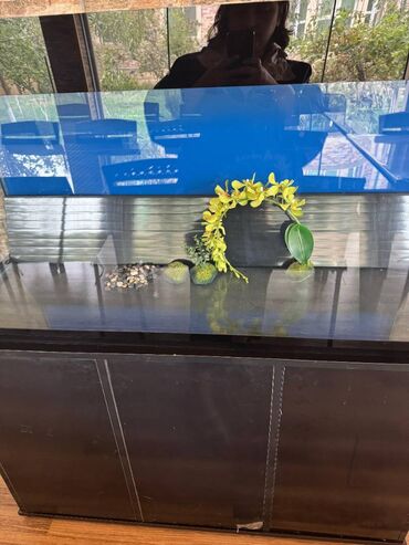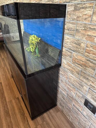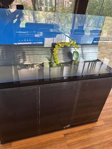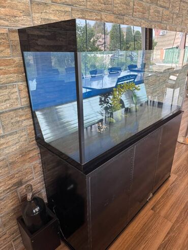 - Böyük ölçülü vitrin tipli akvaryum: geniş ön şüşə, dekorativ ağ çərçivə, üst işıqlandırma, arxa fon dekoru. Aşağıda taxta şkaf/stand (saxlama üçün əlverişli). - Orta ölçülü qövs formalı akvaryum...