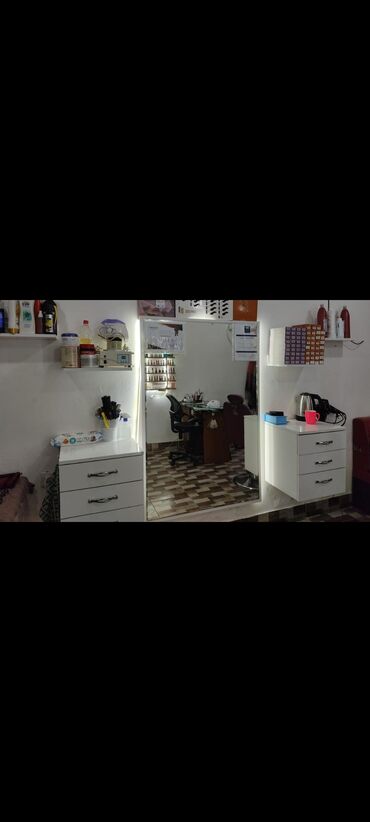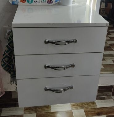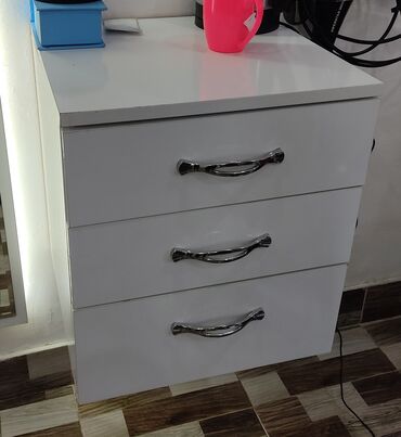 - 2 ədəd 3 çekmecəli asma tumbalar: ağ rəng, parlaq səth, xrom qolbaqlar. Divara bərkidilir, yer tutmur. Alətlər, kosmetika və aksesuarların səliqəli saxlanması üçün uyğundur.