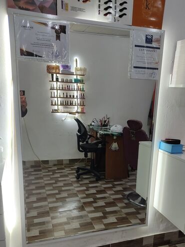 - Böyük divar güzgüsü: çərçivəli, perimetr boyu LED işıq zolağı ilə. Vizaj, saç kəsimi və manikür zonaları üçün geniş görüntü verir.