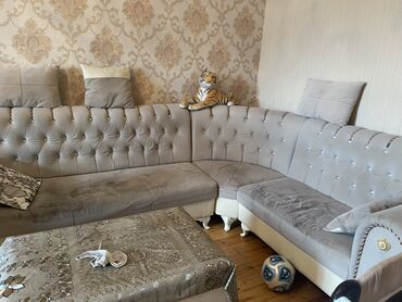 - Yumşaq L formalı divan: açıq boz rəngli, kapitone (romb tikişli) arxalıq və dekorativ düymələrlə. Künc moduluna malikdir, bir neçə iri arxa yastıqla gəlir. Oturacaq və yan dayaqlarda zərif qızılı vurğular, ağ rəngli klassik formalı ayaqlar mövcuddur. Geniş oturma sahəsi sayəsində qonaq otağı üçün rahat seçimdir.