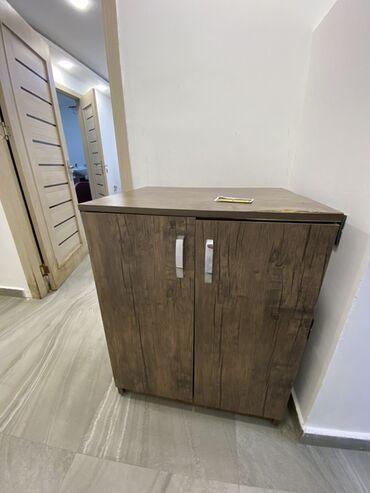 - Kiçik iki qapılı dolab: kompakt ölçülü, üst hissəsi düz, metal tutacaqlar, eyni material və rəngdə.