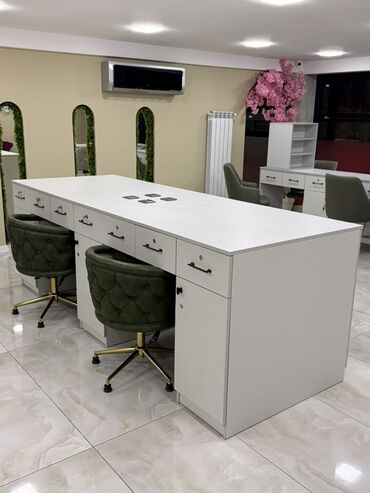 - Manikür/ürün masasI modulu: Böyük iş səthi olan iki tərəfli ada tipli masa. Hər iş yerində çekmece və dolab bölmələri, aksesuar üçün yuvalar. Ağ rəngli, asan silinən üst səth.