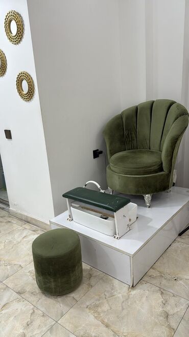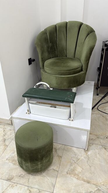 Gözəllik salonu üçün mebel dəsti - Rəng: parlaq qırmızı - Komplekt: 4 ədəd fırlanan salon kreslosu (təkərli, hündürlüyü tənzimlənən metal baza ilə), 1 ədəd saç yuma bölməsi (yastıqlı oturacaq və ü...