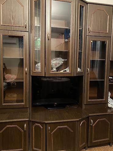 - TV bölməsi: mərkəzdə künc tipli TV üçün nişa (şəkildə LG televizor yerləşir), kabellər üçün arxa keçid.