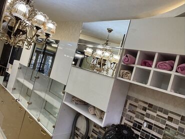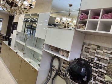 - Material: MDF-Lam və şüşə kombinasiyası, parlaq akril (aşağı modullarda qızılı/bej ton), ağ üst modullar
