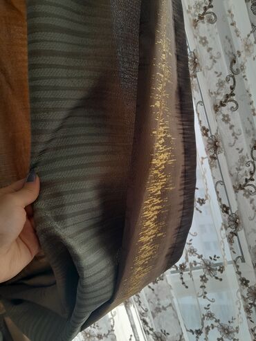 - Qalın pərdələr: Qəhvəyi/bronza/şampan tonlarında ombre keçid, incə zolaqlı tekstura və atlas parıltı; yan tutacaqlarla yığmağa uyğun