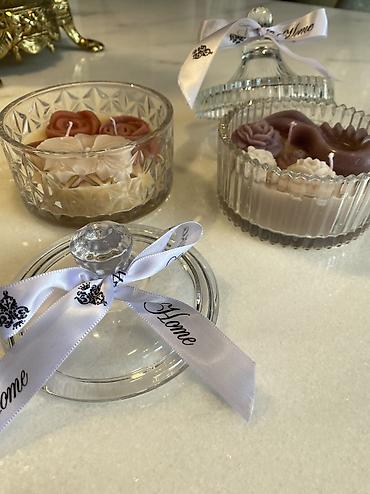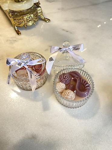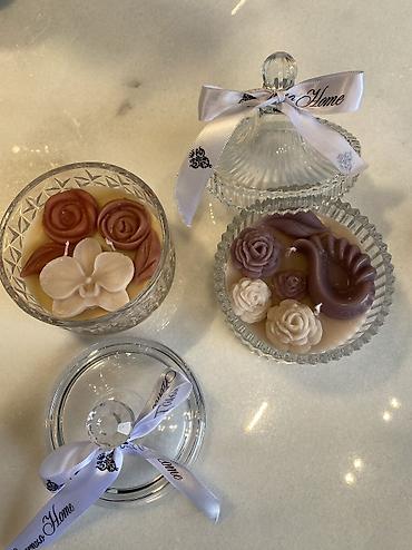 Şüşə qabda əl işi aromatik şamlar. - Növlər: “Kiraz Çiçəyi” (etiketdə qeyd olunub), “Lila(k)” gül motivli variantlar. - Dizayn: Şüşə bankada dekorativ gül formalı iç hissə; bir neçə modeldə taxta ...