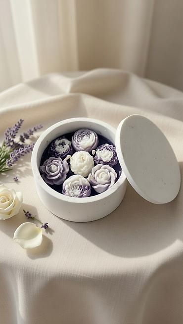 Grova Candle – əl işi aromatik şam buketi - Tərkib: Tamamilə əl işidir; müxtəlif çiçək formalarında hazırlanmış ətirli şamlar (gül, çobanyastığı, pion və s.) kompozisiya şəklində toplanıb. - Mater...