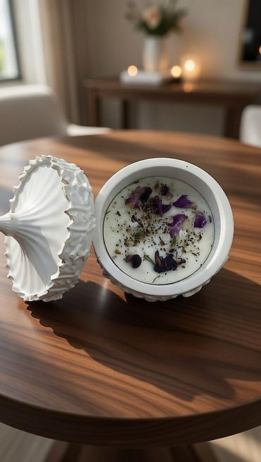 Dekorativ üz formalı şam - Material: Ağ gips/keramika görünüşlü qab, çiçək tacı detallı, heykəl başı formasında dizayn - İçlik: İki rəngli (ağ-bənövşəyi) ətirli mum kompozisiyası - Fitil: Mərkəzdə...