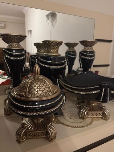 Qara laklı səth və antik qızılı tonların harmoniyası, kənarlarda incə kristal sıraları ilə tamamlanıb. Dəst interyerə parlaq vurğu, klassik və neoklassik tərzi sevənlər üçün dekorativ bütövlük yaradır. Dəbdəbəli görünüş, xüsusi gün bəzəyi və ya gündəlik salon dekoru üçün uyğundur.