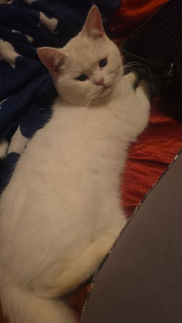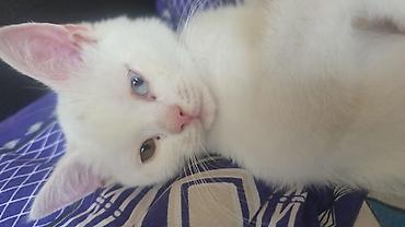 Ağ rəngli, van cinsi erkey.1 yas vaksin peyvend vurulub aksesuarlarida verilir qısa tüklü ev pişiyi. Gözlər heteroxromiyalıdır: biri mavi, digəri sarı-yaşıl tonludur. Burun çəhrayı, bığcıqlar ağ, q...