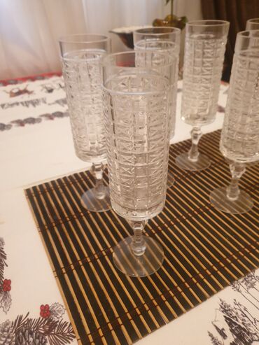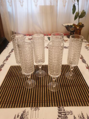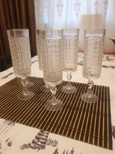 Kəsik naxışlı şüşə şampan qədəhləri dəsti - Miqdar: 6 ədəd - Material: şəffaf şüşə, əl ilə oyma/kəsik dekor - Dizayn: uzun saplı, nazik boğazlı fleyta forması; yan səthlərdə ulduz və oval motivli ...