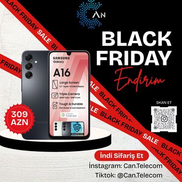 Samsung Galaxy A16 - Model: Galaxy A16 (qutusu ilə) - Rəng: Qara - Arxa kamera: 3 linzalı sistem + LED fləş - Ön kamera: ekranın yuxarı mərkəzində damcı tipli çıxıntıda - Ekran: tam ekran, nazik ç...