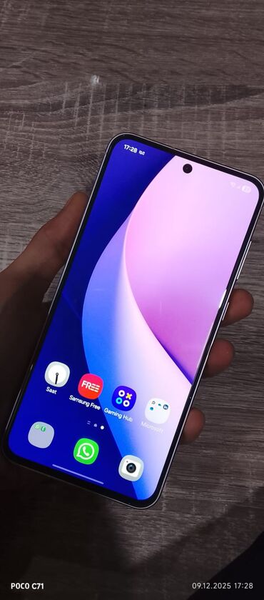 - Əməliyyat sistemi və tətbiqlər: One UI interfeysi, ekranda Samsung Free, Gaming Hub, Microsoft, Saat, Kamera və WhatsApp kimi tətbiqlər görünür.