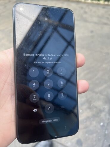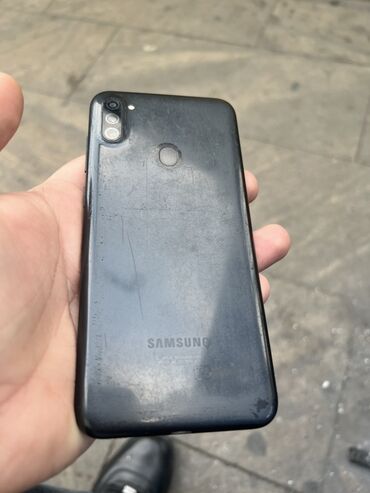 Samsung Galaxy A11 smartfonu. Cihazın arxa hissəsində üçlü kamera modulu və barmaq izi sensoru mövcuddur. Qarşı tərəfdə damcı formalı çentikli ekran, təhlükəsizlik üçün barmaq izi və PIN kodu daxil etmə funksiyaları ilə təchiz olunub. Qara rəngdə dizaynı ilə gündəlik istifadə üçün uyğun bir mobil telefondur.