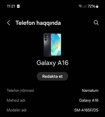 - Model haqqında ekran görüntüsü: Galaxy A16, SM‑A165F/DS göstərilir