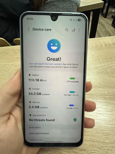 - Yaddaş/RAM: 128 GB daxili yaddaş + 6 GB RAM. Şəkildə Device Care ekranında 73.7 GB/128 GB boş yer görünür.