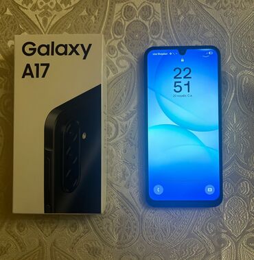Samsung Galaxy A17 - Model: Galaxy A17 (qutu) - Rəng: Mavi ton (qutudakı təsvirə əsasən) - Arxa kamera sistemi: üçlü modul + LED flaş - Yan hissədə fiziki düymələr (güc və səs) - Samsung ekosistem...