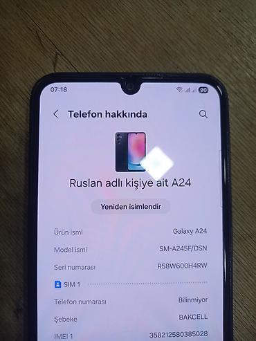 - Daxili məlumat ekranı: “Telefon haqqında” bölməsində model Galaxy A24, seriya R58W600H4RW, IMEI1 görünür