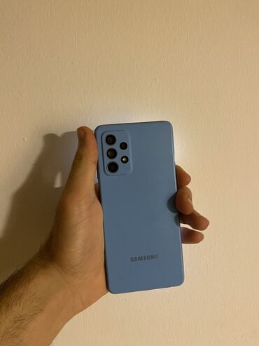 Samsung Galaxy A52 (mavi) - Ekran: 6.5" Infinity‑O displey, ön kamera üçün mərkəzdə punch‑hole - Arxa kamera sistemi: 4 obyektivli quruluş (geniş, ultra‑geniş, makro və dərinlik modulları), LED iş...