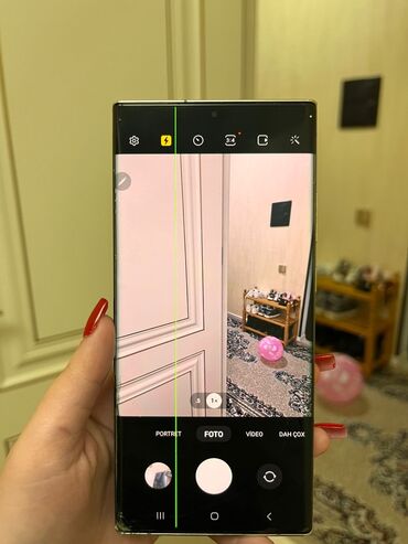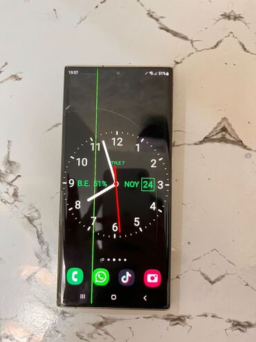- 6.9" kənarlara əyilmiş Dynamic AMOLED 2X ekran, Always‑On Display. Ekranda soldan yuxarıdan aşağıya qədər yaşıl şaquli xətt görünür.