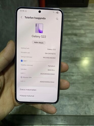 Telefon haqqında ekranında “Galaxy S22” göstərilir, IMEI məlumatları mövcuddur. WhatsApp, Instagram, TikTok və digər tətbiqlər quraşdırılıb. Dual SIM dəstəyi ilə gündəlik istifadə, foto/video çəkilişi və performans üçün ideal kompakt flaqman.