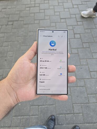 - Batareya və proqram: One UI interfeysi, Cihaz baxımı ekranında “Harika!” statusu görünür; enerji istifadəsi və performans profili seçimləri