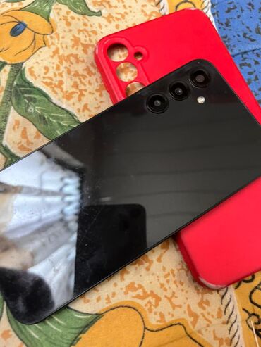 Samsung smartfon (arxa panel görsənir) və qırmızı silikon qoruyucu örtük dəsti.