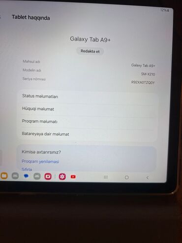 - Model: Galaxy Tab A9+ (SM-X210) – ekranda “Tablet haqqında” bölməsində görünür