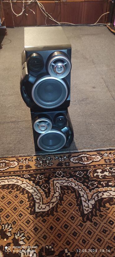 - Samsung mini hi‑fi musiqi mərkəzinin akustik dəsti: 2 ədəd çoxzolaqlı passiv kolonka. Hər kalonkada iri woofer, orta diapazon dinamikləri və yüksək tezlikli tweeterlər var. Ön tərəfdə metal qəfəsli səsgücləndirici hissələr, yanlarda rezonator çıxışları görünür.